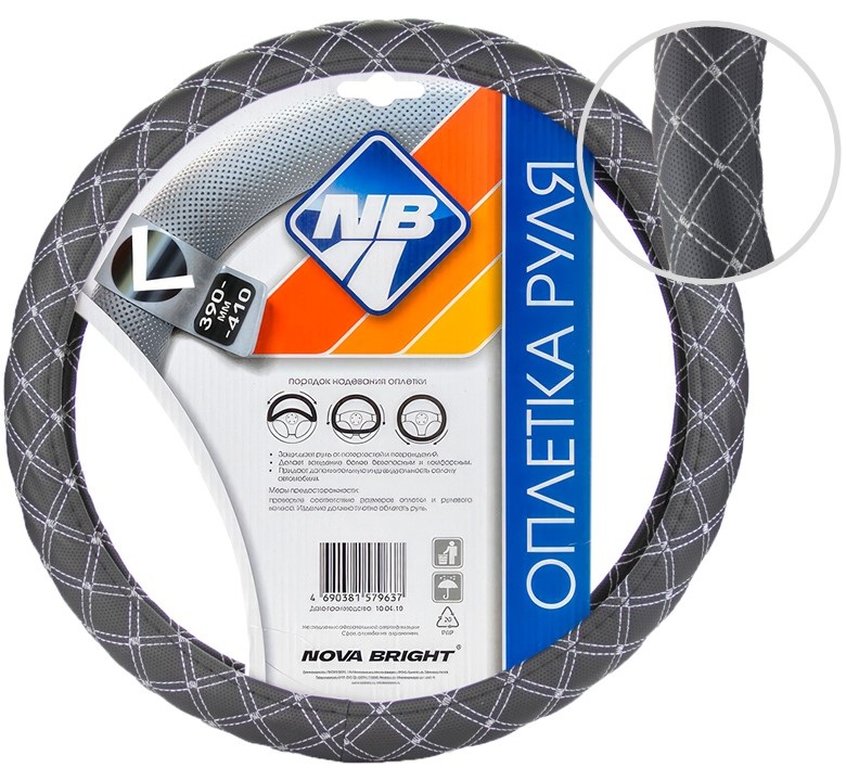 Оплетка рулевого колеса "Nova Bright" (L) экокожа, черная с серой прострочкой ромбиками