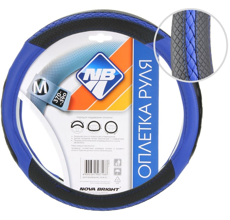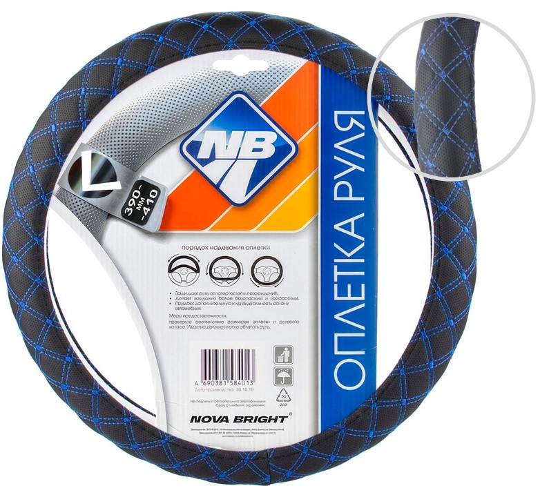 Оплетка рулевого колеса "Nova Bright" (L) экокожа, черная с синей прострочкой ромбиками