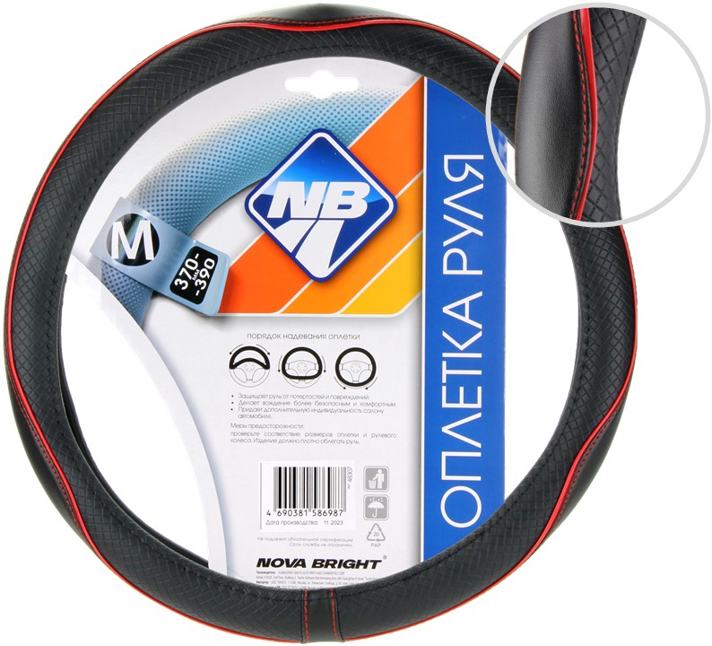 Оплетка рулевого колеса "Nova Bright" (М) экокожа, черная с фигурным тиснением и красной отделкой