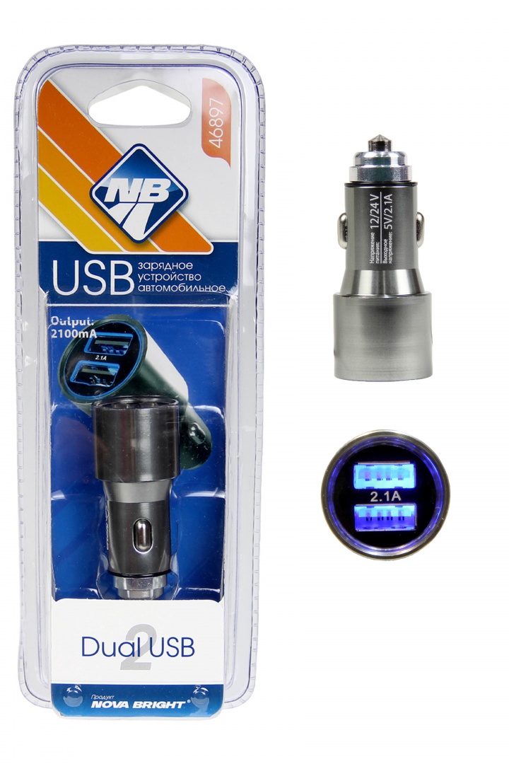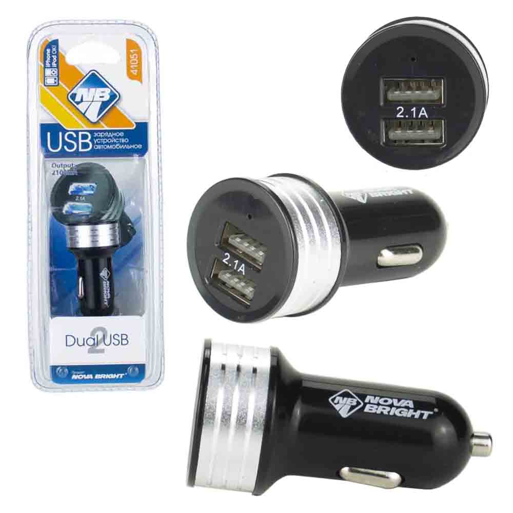 Зарядное устройство "Nova Bright" для моб. телефонов, 2 USB-порта, 2100мА, 12/24В