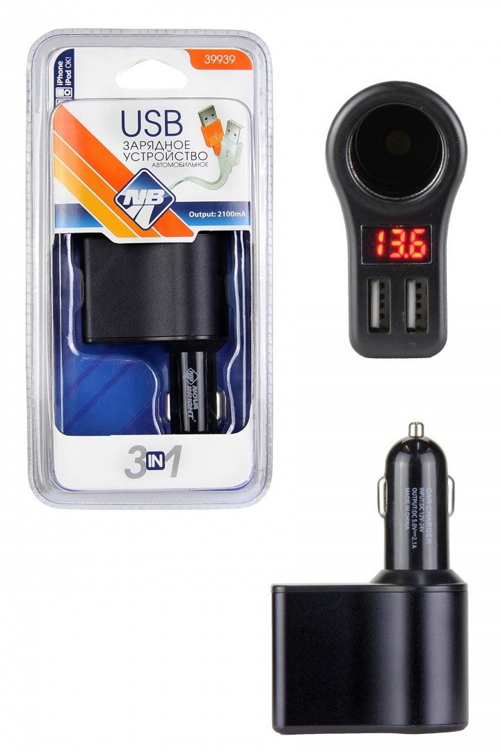 Зарядное устройство "Nova Bright" для моб.устройств+разветв. электропит.1гнездо+2USB-порта, 2100мА, цифровой вольтметр, LED подсветка, 12/24