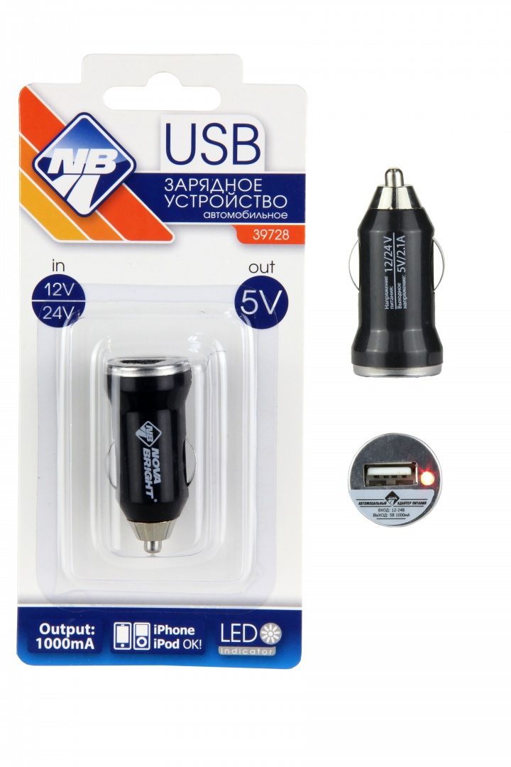 Зарядное устройство "Nova Bright" для моб.устройств, USB-порт, 1000мА, LED индикатор, 12/24В